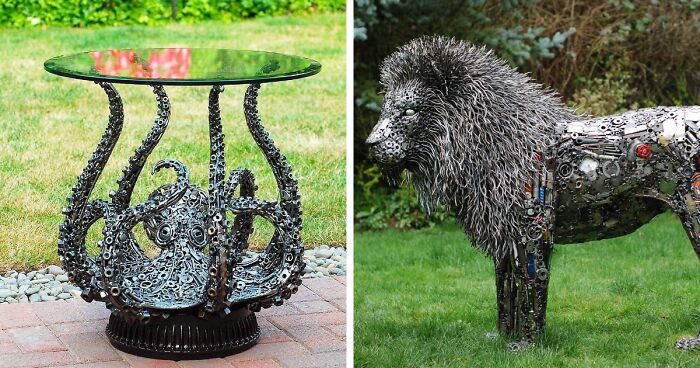 "Mis esculturas están hechas completamente de artículos recuperados y materiales reutilizados (casi todos de metal, pero a veces agrego trozos de plástico para dar color). Me gusta que la gente interactúe con ellos, se diviertan buscando objetos que puedan identificar. Comenzó como un hobby, pero a medida que fui mejorando en la escultura, lo convertí en una profesión de tiempo completo ”, dijo a Bored Panda el artista, cuyas geniales esculturas se exhiben en todo el país.