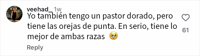 En el video, la dueña escribe: "Mamá era pastor alemán. Papá, golden retriever. Son la combinación perfecta de lealtad, atención, protección y dulzura. Les presento a nuestro 'Pastor Dorado': leal como un pastor alemán, cariñoso como un golden retriever. Disfrutarás de la suavidad, la inteligencia y los mimos en un paquete perfecto".