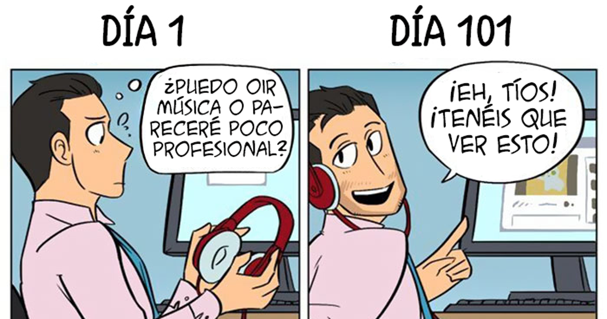 Cuando conseguimos un trabajo nuevo, siempre estamos deseosos de impresionar. Llegamos a tiempo, queremos caerle bien al jefe y a todo el mundo... Pero con el tiempo esas ganas desaparecen y tu nuevo y emocionante trabajo se convierte en otra cosa que hacer para pagar las facturas. Echa un ojo a este divertido cómic que muestra cómo cambia nuestra actitud hacia el trabajo con el tiempo. Han sido dibujados por Karina Farek para