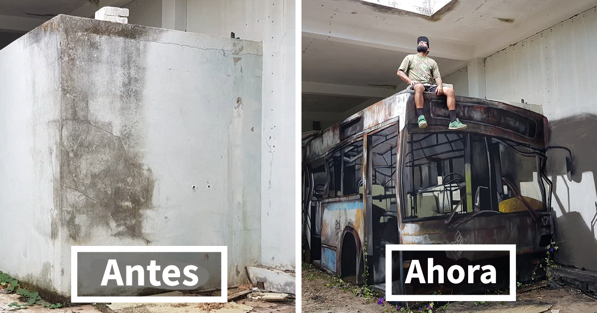 Conocido por hacer obras extraordinarias en 3D, esta vez decidió usar spray para transformar un bloque de cemento en un autobús abandonado. Los detalles son tan impresionantes, que al ver las fotos del proyecto, la gente cree que está viendo un autobús.