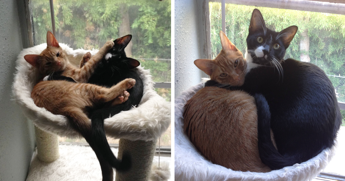 Barnaby y Stoche llevan durmiendo juntos desde que fueron adoptados por el usuario de Reddit Whitedevilwhitedevil. A estos hermanos les encanta hacer la cuchara y pueden llegar a ser muy creativos a la hora de compartir la cama ahora que casi son más grandes que ella.