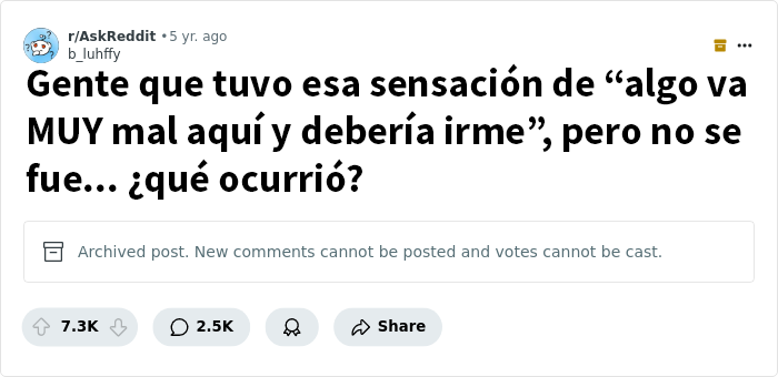Cuando tenía 15 años, volvía caminando del colegio a casa y decidí tomar un atajo por un barranco para acortar un par de minutos. No era un lugar especialmente peligroso; el tramo de sendero por el que caminaba solo tenía unos cientos de metros y estaba bordeado por los patios traseros de las casas, pero mis padres me decían que nunca bajara solo. Así que iba caminando, y más adelante vi a un par de chicos parados cerca de la salida de mi calle. En mi interior, empecé a asustarme y tuve la fuerte sensación de que debía darme la vuelta. Aunque suene estúpido, la principal razón por la que no me di la vuelta fue porque ambos eran personas de color y no quería que pensaran que era un chico racista que se daba la vuelta y salía corriendo al verlos. Además, serían quizás las 3 de la tarde y no estábamos en una zona precisamente aislada. Así que seguí caminando, y, efectivamente, al acercarme a ellos, salieron al sendero y me bloquearon el paso. De repente, me apuntaron con una pistola a la cara, y me quitaron mi billetera y mi iPod. Y vaya si me dijeron que diera la vuelta y regresara por donde había venido, así que tuve que tomar el camino más largo a casa.