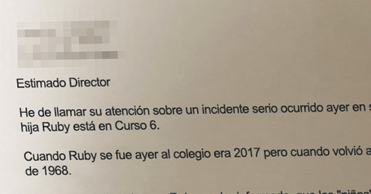 escrito una carta demandando una explicación por parte de la institución educativa, asegurando que su hija dejó la casa el martes por la mañana en el año actual 2017, fue transportada a 1968 al entrar el edificio escolar, y fue devuelta a él cargada de horrorosas historias sobre excursiones segregadas por sexo. "Mi reacción fue de decepción," contó a